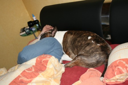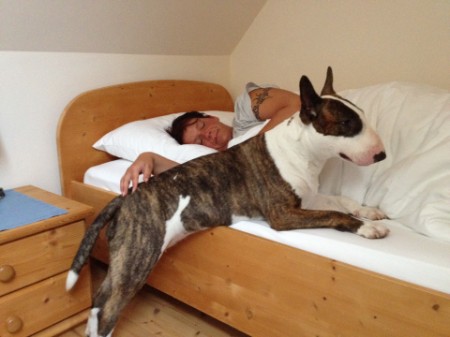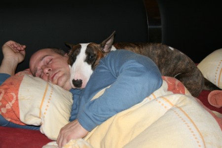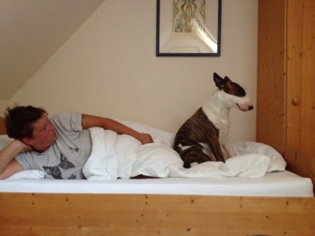 | |  | Herrchen ist das beste Kopfkissen - Jan. 2012 | | Maggie with Günter in our bed - Jan. 2012 |